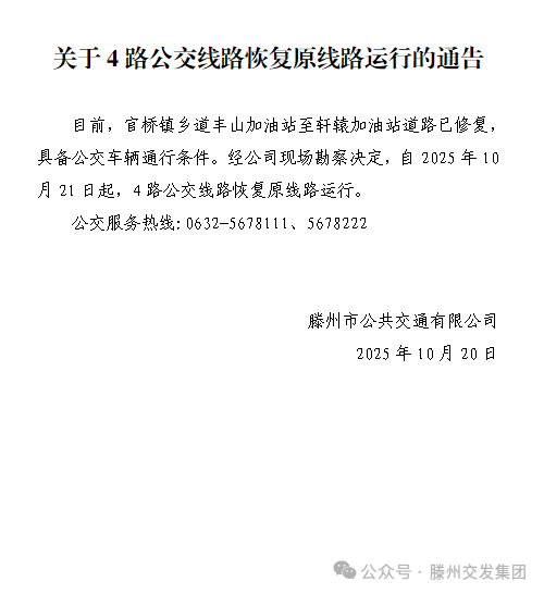 關于4路公交線路恢復原線路運行的通告